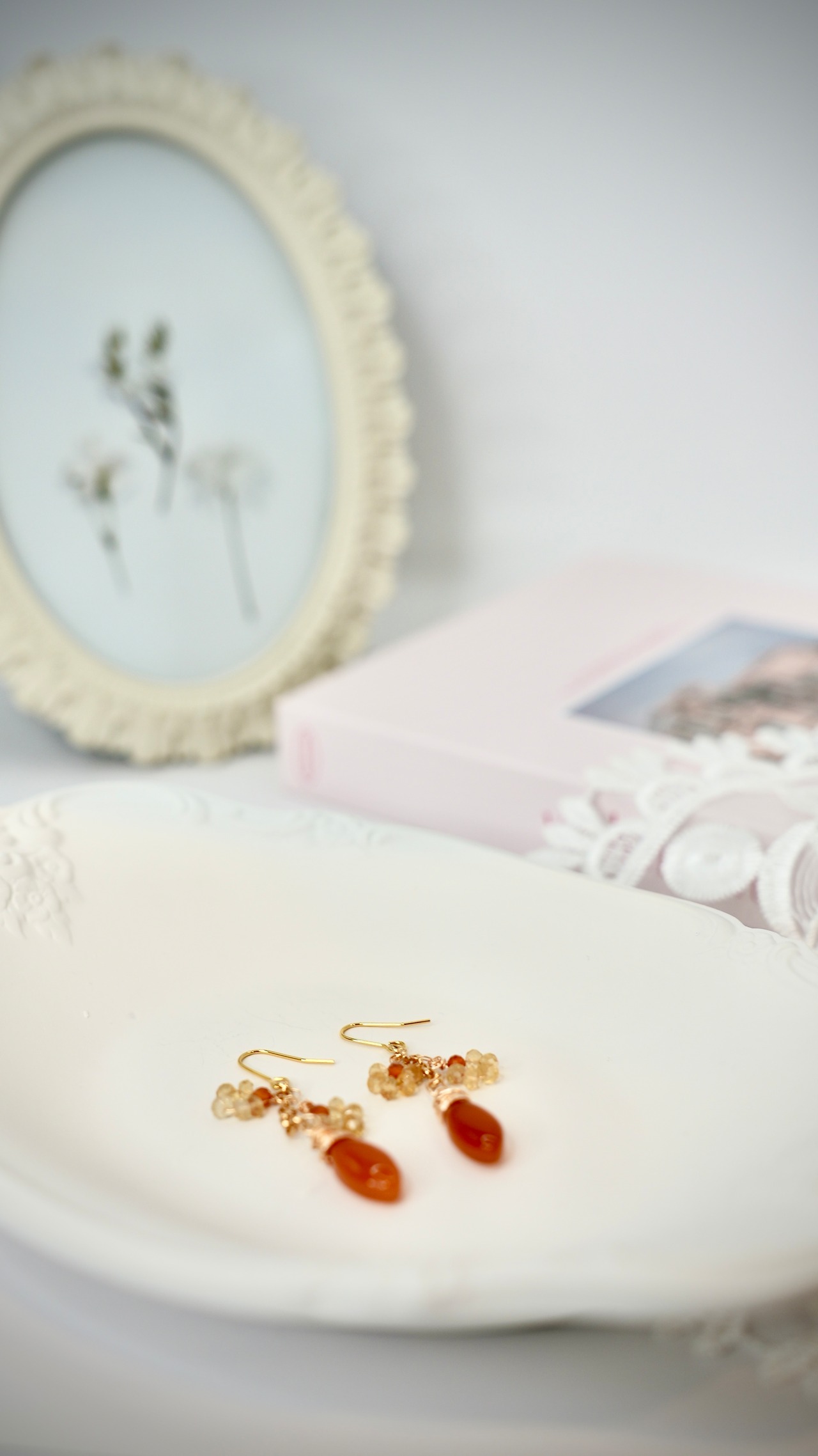 春先に向けて季節が進み、華やかなスタイルが楽しめる時期にぴったりな「カーネリアンとシトリンのミモザピアス」。天然石のカーネリアンを使用したプルンとしたマーキス型のドロップが耳元で揺れ、流れるような美しさを演出します。そこに添えられたシトリンが、春のミモザを思わせる甘く華やかなモチーフとなり、普段使いはもちろん、特別な日のコーディネートにも彩りを添えます。